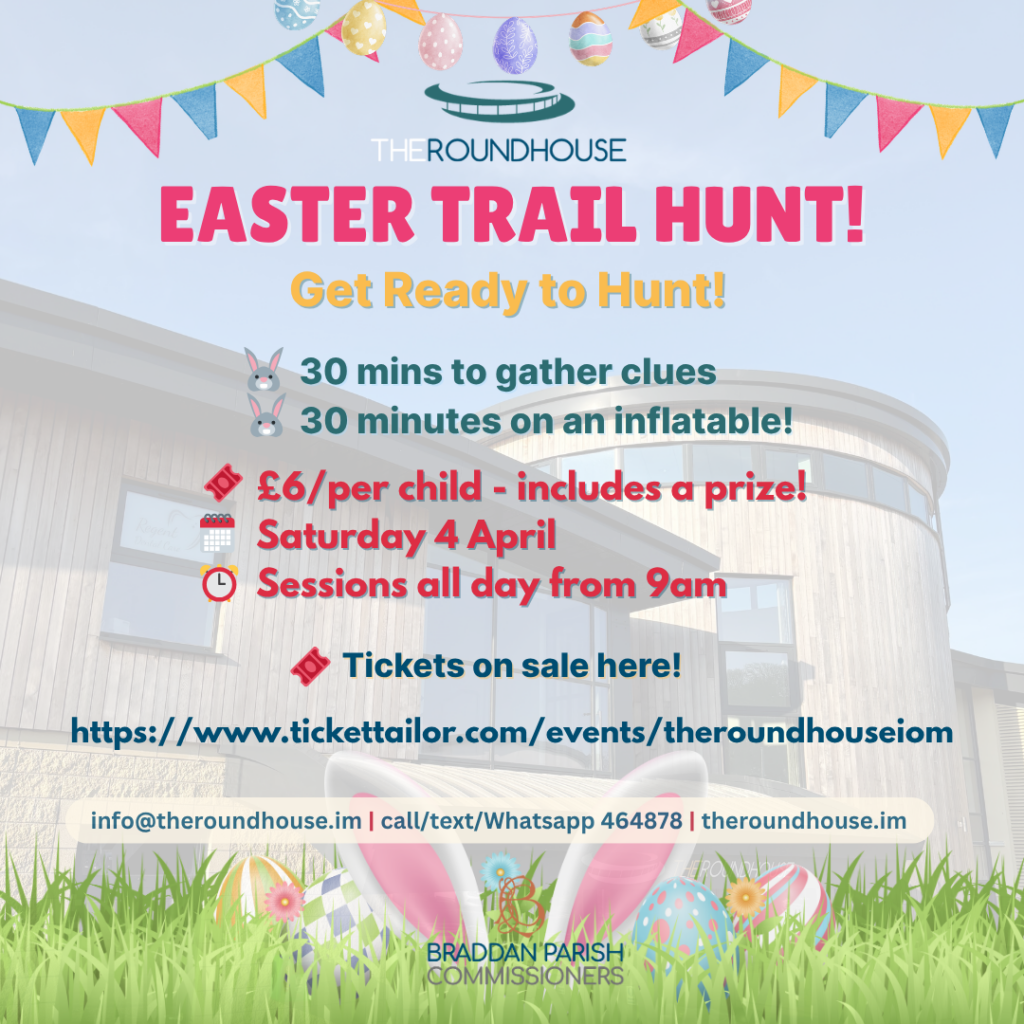 Join us at The Roundhouse, Braddan for an exciting Easter adventure packed with clues, treats, and bouncy fun!