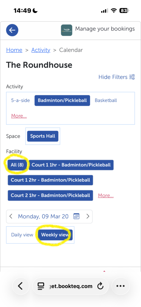 Single badminton or pickleball courts – to check the availability of all four badminton or pickleball courts for both one and two hour sessions at the same time for the following week, under Facility, select All (8) and Weekly view as highlighted in yellow below.