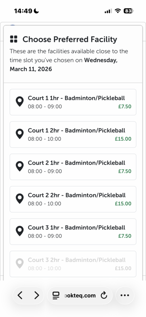 The image below shows the availability of courts 1 to 4 on the same day for both 1 and 2 hours.