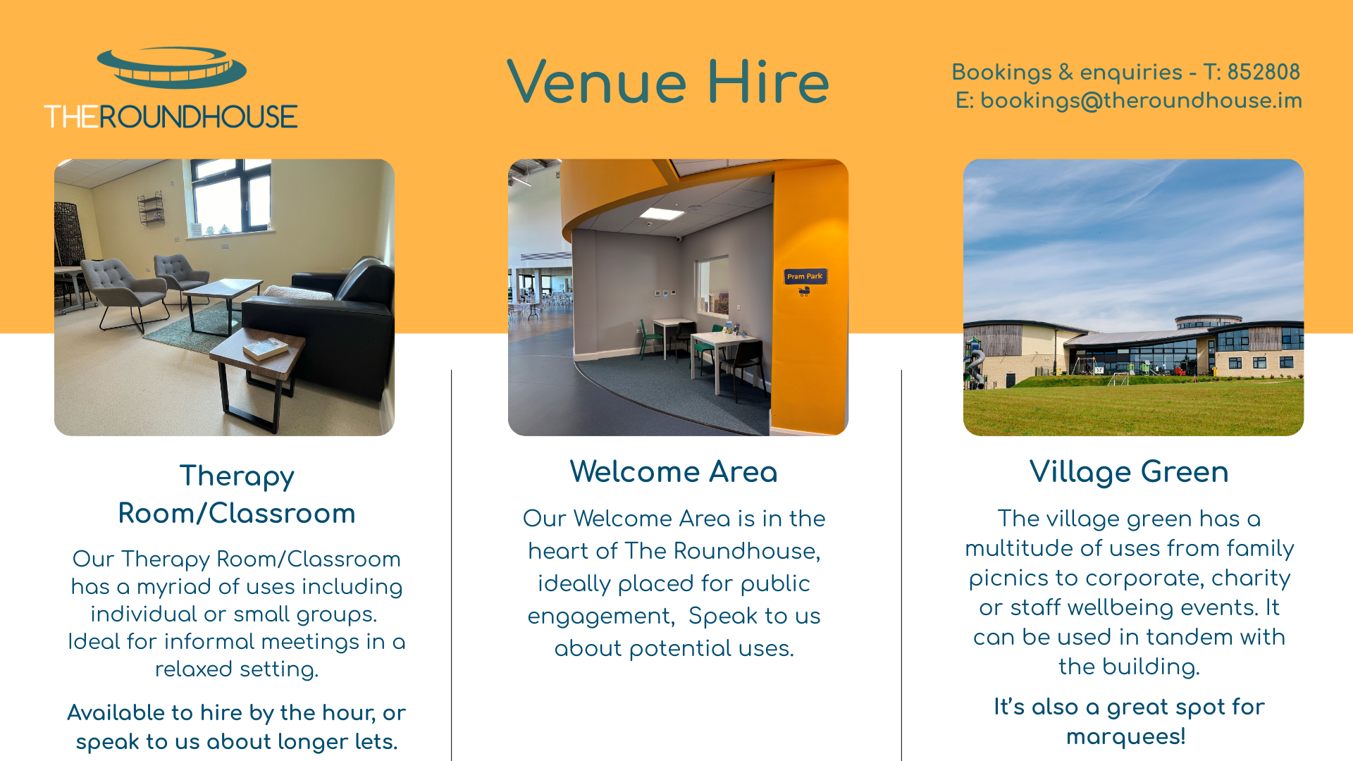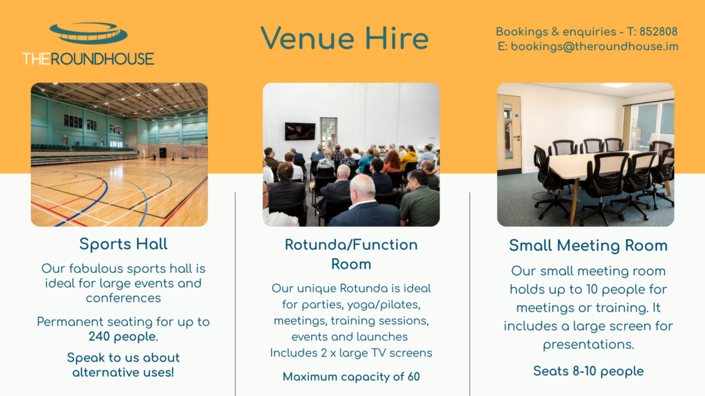 For more information about any of our flexible, modern spaces, or to chat about potential uses, please contact us on 852808 or bookings@theroundhouse.im
